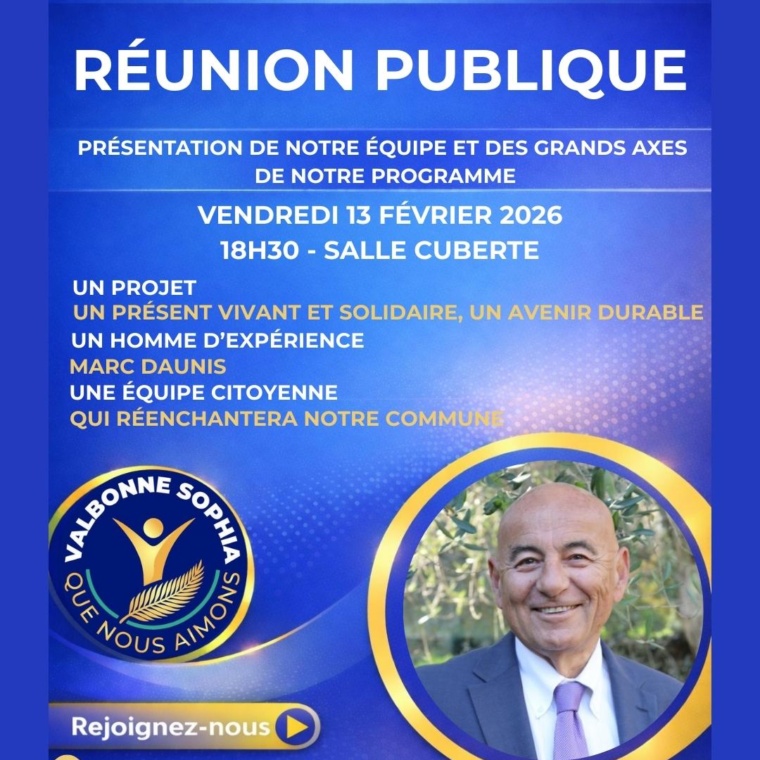 La liste Valbonne Sophia que nous aimons, conduite par Marc Daunis, vous convie à une réunion publique le 13 février 2026 à la…
