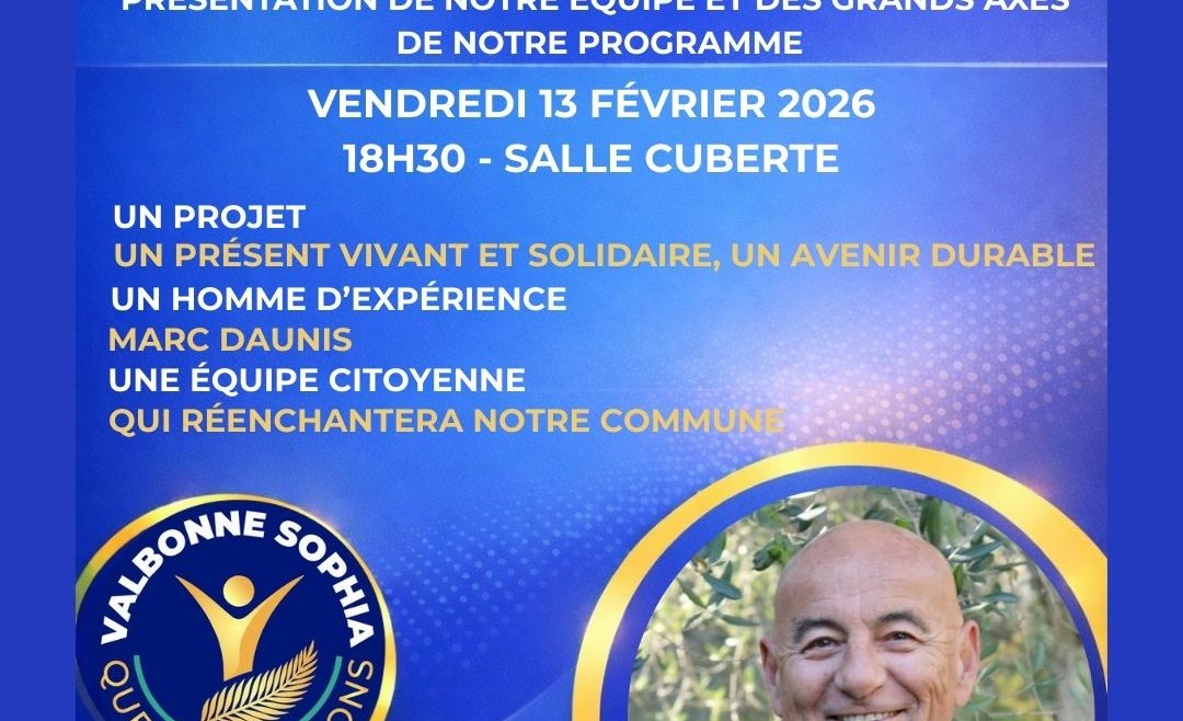 La liste Valbonne Sophia que nous aimons, conduite par Marc Daunis, vous convie à une réunion publique le 13 février 2026 à la Salle Cuberte à 18h30.